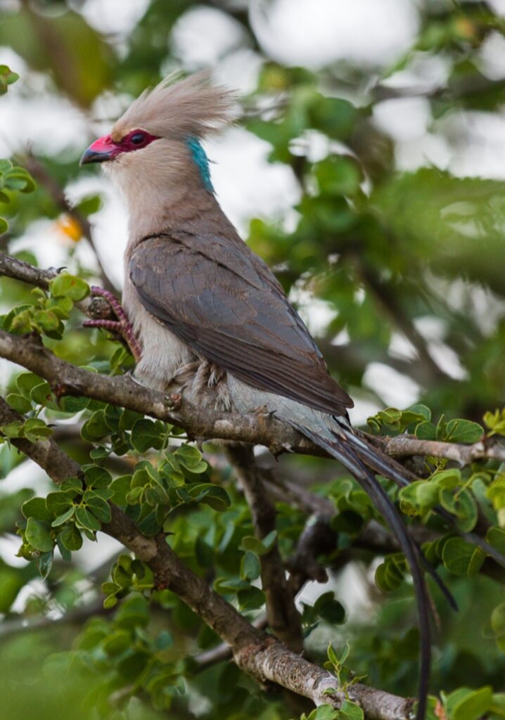 Admire the blue-naped coly’s striking appearance, with its general greenish ash-grey hue complemented by a distinctive turquoise-blue patch on the nape. Its long and slender tail feathers add elegance to its silhouette, while its crested head and deep carmine-red bare face add a touch of vibrancy to its overall look.